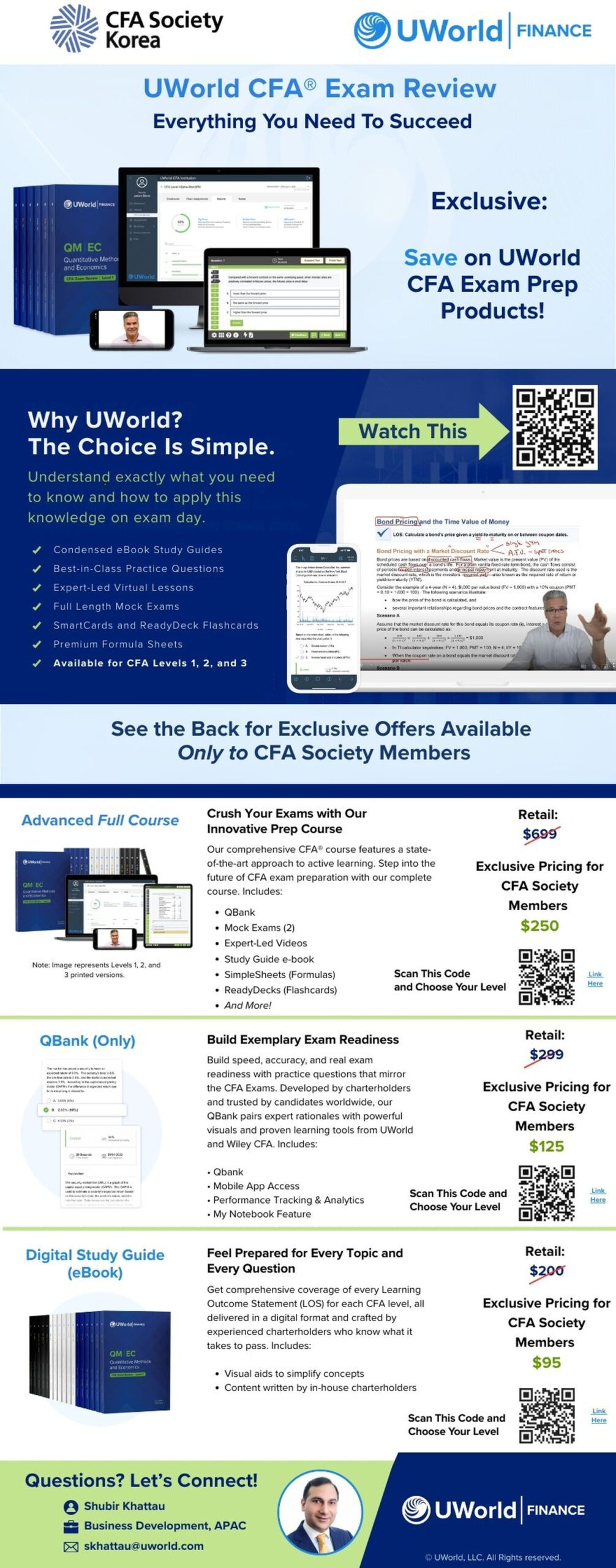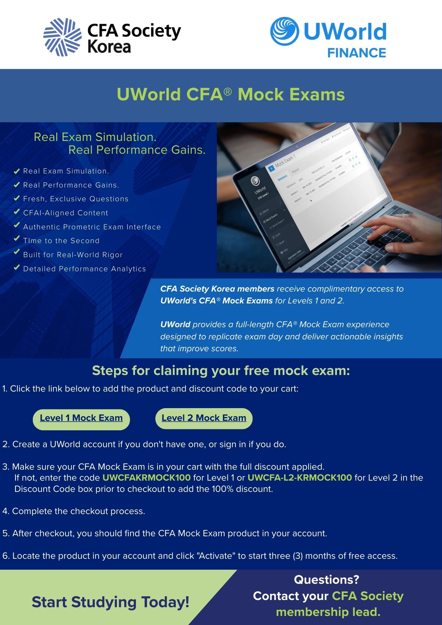 CFA Society Korea는 CFA 시험을 준비하는 Candidate 여러분께 도움을 드리고자 글로벌 시험 준비 플랫폼 UWorld와 제휴를 맺었습니다.