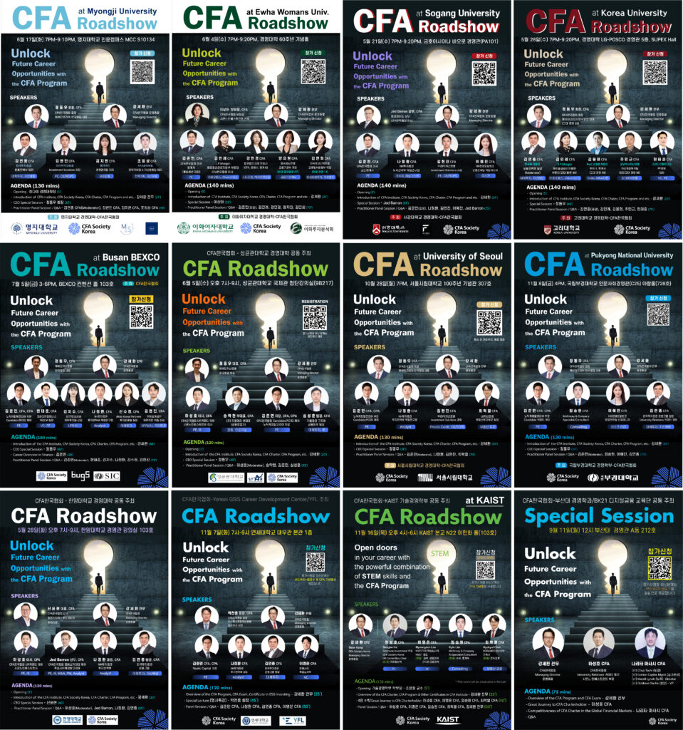 CFA Roadshow는 금융 분야에 진출하고자 하는 학생들에게 CFA Program을 소개하고 CFA Charterholder CEO/임원과 실무자로 구성된 연사들로부터 다양한 실무 경험과 통찰력을 얻을 수 있는 기회를 제공하고자 하는 목적으로 진행하고 있습니다.
